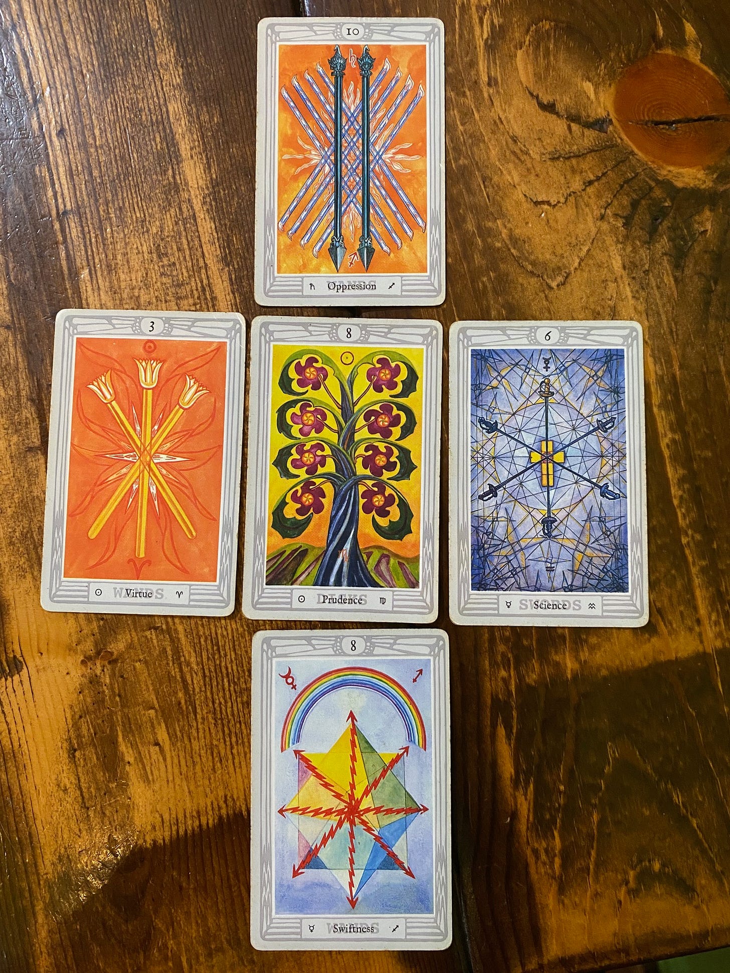The energies supporting this transition from above and below are also elemental fire cards, confirming the intensity of these experiences. The 10 of Wands, with Saturn in Sagittarius, signifies an ending of traditional and oppressive structures that have been middle men to peoples direct connection to Spirit / Source / God for millenia. This will be very unsettling for anyone that still has parts or all of their belief systems being held by external authorities. We’ll see how people unconsciously revert to being dictators in their own little worlds, projecting this into their relationships and communities, to maintain some sense of power and control as these energetic pillars burn to ash. Interestingly, the card below, the 8 of Wands which has Mercury in Sagittarius, is the liberator energy that is bringing about this upending of dogma and control. The arrow has been loosed and the multi-directional, multi-dimensional energies that are in motion cannot be put back into the genie lamp at this point. I hate to say that this brings a thread of hope into the field, but there is a bright note coming in under the surface of the destruction and suffering. These ideas of good and bad, positive or negative, are highly relative depending on ones position and perception, and in the larger universal picture these stories and meanings completely dissolve, all just is.