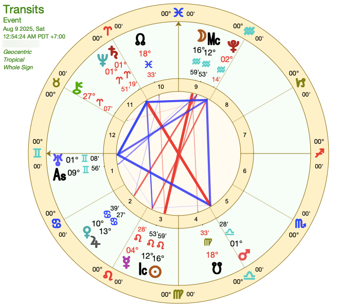 Summer’s flashpoint. Mars is in the final degrees of Virgo, just a few degrees from the exact opposition to Saturn and Neptune in Aries. The tension is starting to ratchet up this first week of August, with a noticeable crank in intensity on August 6th when Mars enters the cardinal air of Libra, peaking the 8th - 11th, with another lightning bolt flash of change on the 9th with the Aquarian Full Moon. Also take a note on what gets triggered August 5th - 6th when Mars sits at 29º Virgo, as the wild Solar Eclipse on September 21st happens at this exact degree, so we may see a foreshadowing of what is coming to an end at that time.